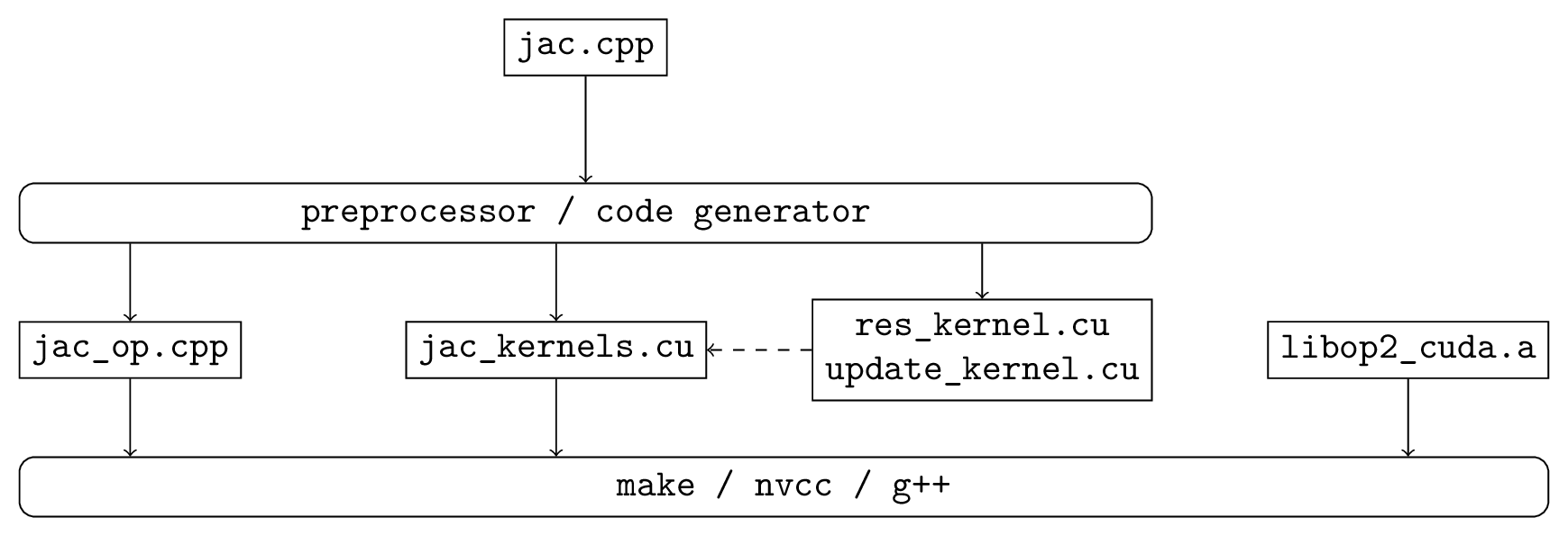 Fig. 2 shows the build process for the corresponding CUDA executable. The code-generator parses the user’s main program and produces a modified main program and a CUDA file which includes a separate file for each of the kernel functions. These are then compiled and linked to the OP libraries using g++ and the NVIDIA CUDA compiler nvcc, again perhaps controlled by a Makefile.