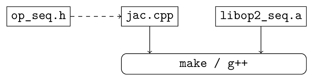 Fig. 1 shows the build process for a single thread CPU executable. The user’s main program (in this case jac.cpp) uses the OP2 header file op_seq.h and is linked to the appropriate OP2 libraries using g++, perhaps controlled by a Makefile.